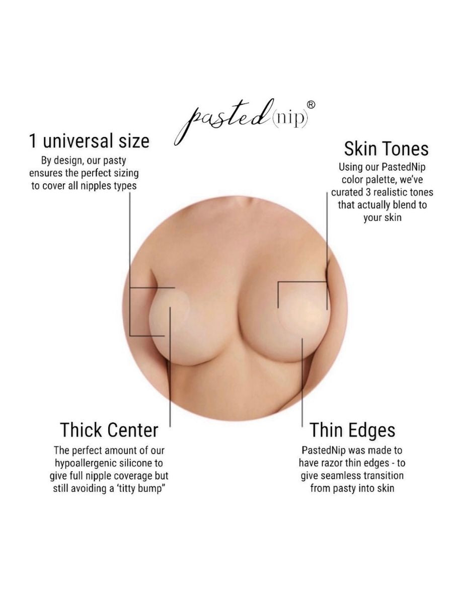 Pasted Nip pasties are made with body safe silicone. Our pasties come in light, medium, and dark with a round shape versatile enough to fit over a variety of nipple shapes and sizes. Our pasties matte finish ensures they will not shine through clothing in photographs or bright lighting. Waterproof & sweatproof, ensuring enough stickyness for up to 15x wears.